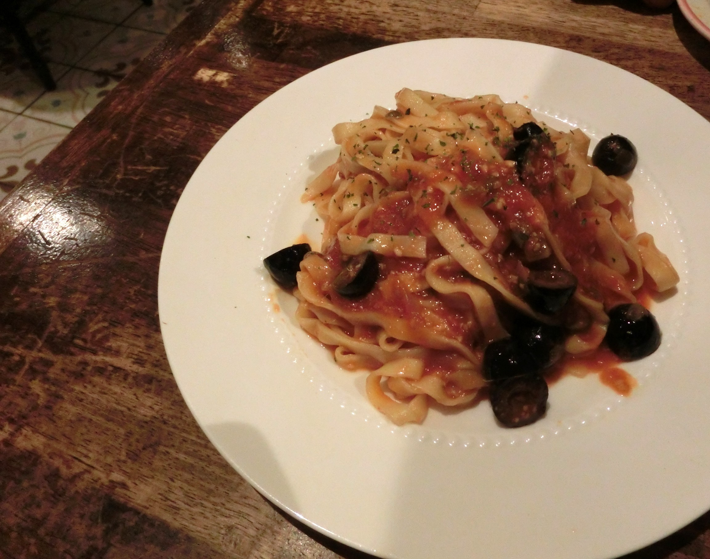 アンチョビやケーパー、オリーブが入ったトマトベースのパスタで、ほどよい塩味がいい!